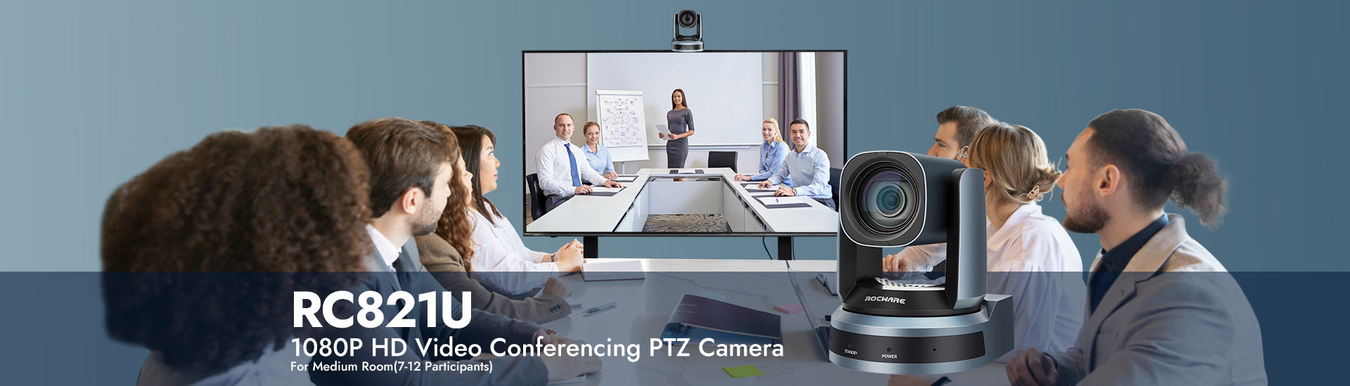 RC821U kann die Anzahl und Verteilung der Teilnehmer durch Gesichtserkennung genau erfassen, PTZ-Kameras intelligent steuern, um alle Teilnehmer im Bildschirm einzufangen, und sich auf den besten Bildschirm einstellen.