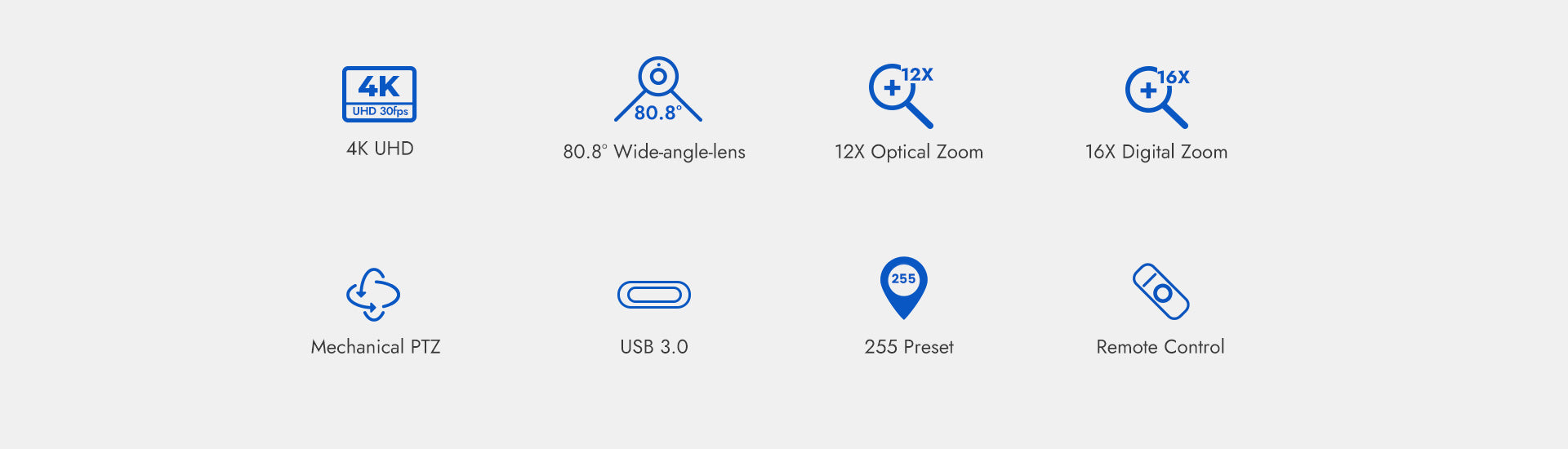Die Rocware RC841U 4K UHD Video PTZ-Kamera verfügt über Sonys 1/2,5-Zoll-CMOS-Sensor mit 4K-Qualität bei beeindruckenden 30 fps. Der horizontale Winkel beträgt angenehme 80,8° und sie hat einen 12-fachen verlustfreien optischen Zoom.