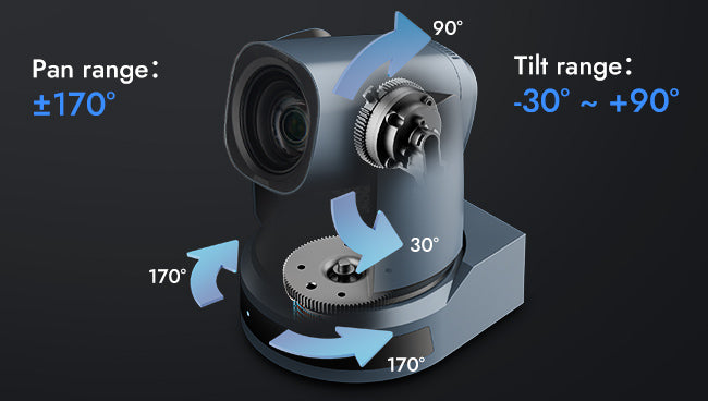 Ausgestattet mit einem geräuschlosen mechanischen PTZ verfügt diese Kamera über einen horizontalen Drehbereich von ±170° und einen vertikalen Drehbereich von -30° bis +90°, wodurch der gesamte Konferenzraum vollständig abgedeckt wird und keine toten Winkel bleiben, selbst in Eckpositionen.